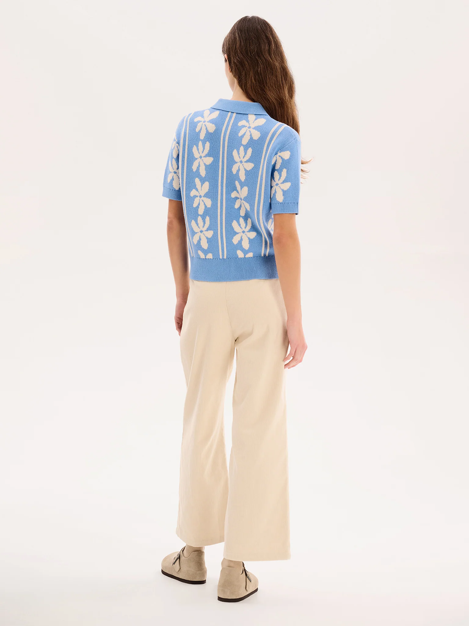 In a blue floral print, Haisley is our take on the knitted shirt. Crafted from ethically sourced cotton, she’s got a mini-collar and button detail. Slightly cropped at the waist, pair with your favourite responsible denim.