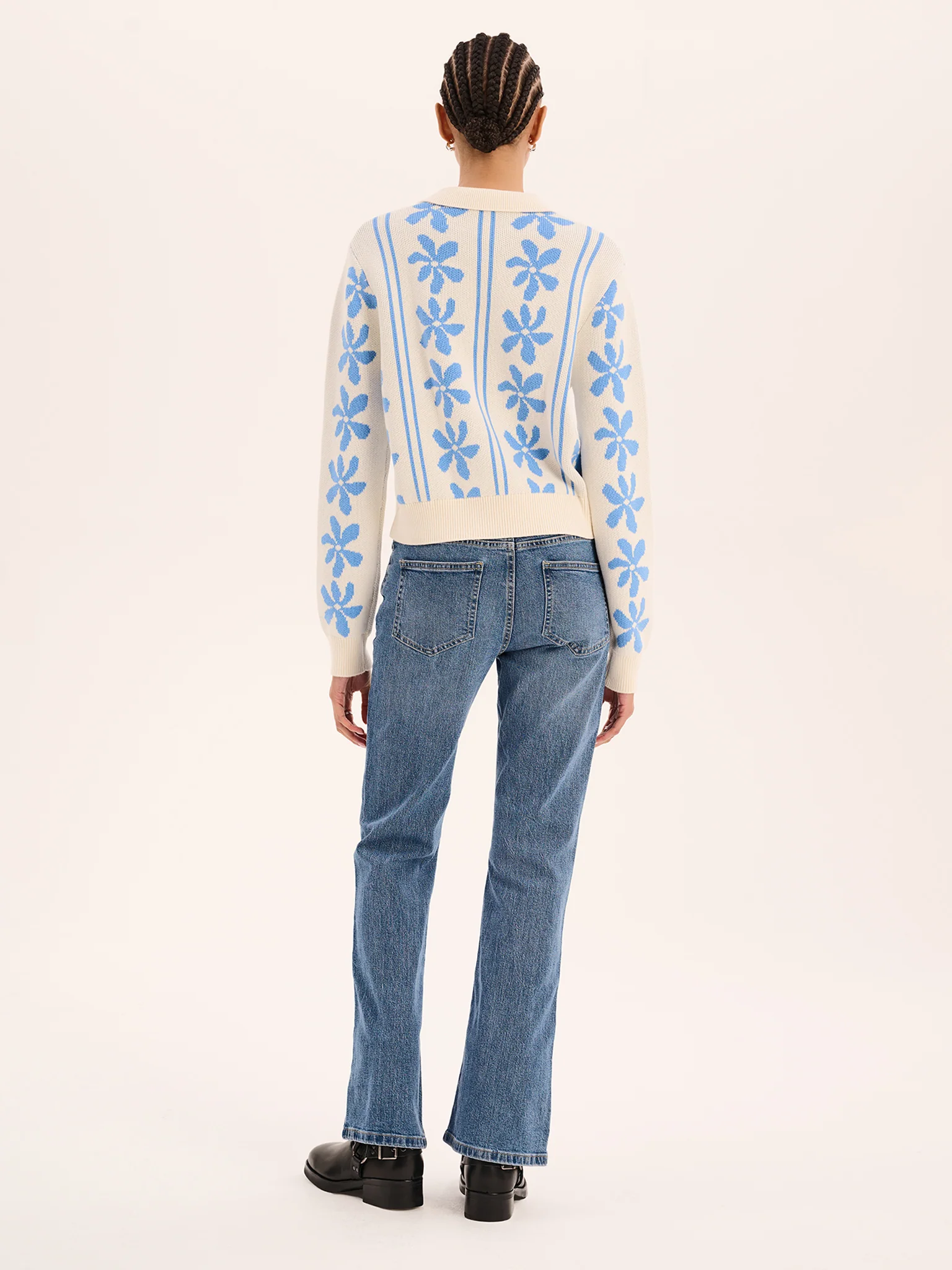 Loren has all the right details. A polo-inspired collar and button detail are cheekily contrasted by an illustrated flower motif in cream and cornflower blue. This richly woven, cotton cropped jumper has been responsibly sourced from BCI members so it’s as kind to the planet as it is luxurious to feel.