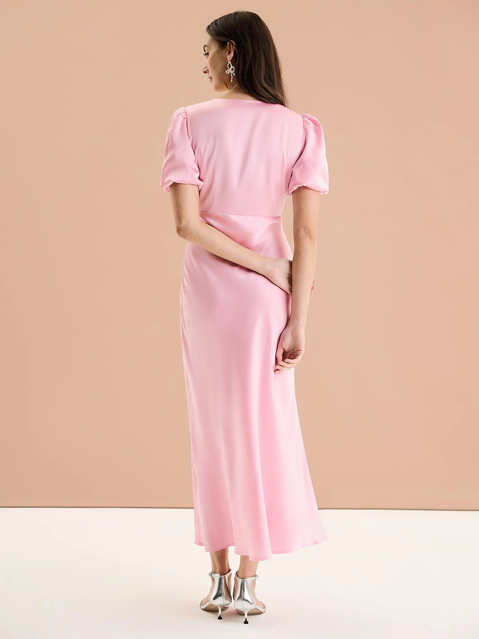 In the softest shade of pale pink, Rosie is as effortless as she is elegant. Short balloon sleeves playfully draped in our signature recycled satin add a twist of texture to this classic neckline. Maxi in length and bra-friendly, she’s the perfect bridesmaid, wedding guest or date night dress. Rosie is the dress that does it all.